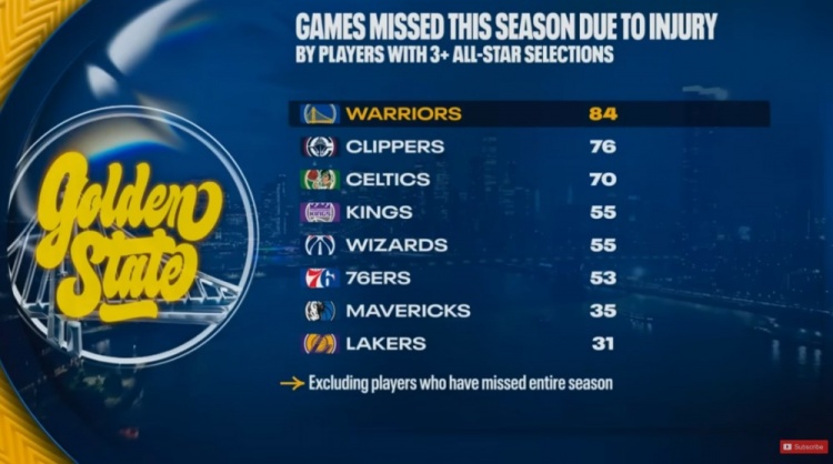 备注:包括赛季报销球员1、勇士 84场2、快船 76场3、凯尔特人 70场4、国王 55场奇才 55场6、76人 53场7、独行侠 35场8、湖人 31场...