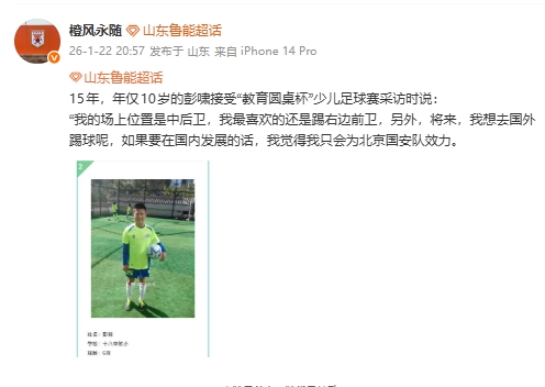 01月22日讯 今日,著名山东泰山博主橙风永随晒出彭啸10岁时一张照片。该博主原文15年,年仅10岁的彭啸接受“教育圆桌杯”少儿足球赛采访时说:“我的场上位置是中后卫,我最喜欢的还是踢右边前卫,另外,将来,我想去国外踢球呢,如果要在国内发展的话,我觉得我只会为北京国安队效力。 ...